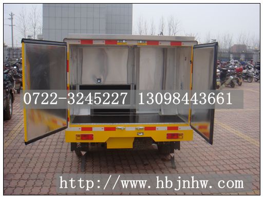 2、廂體分為兩部分:A:運(yùn)輸炸藥;B:運(yùn)輸雷管(防爆罐或防爆箱);C:炸藥,雷管同時(shí)運(yùn)輸(廂體必須隔倉(cāng),分倉(cāng)運(yùn)輸,加裝防爆罐或防爆箱)。廂體為雙層金屬骨架結(jié)構(gòu),外部為冷扎鋼板,內(nèi)壁采用鋁合金板蒙面,夾層為隔熱阻燃材料填充。設(shè)置對(duì)開門,如需安裝抗暴容器則增開側(cè)門,側(cè)壁設(shè)有防雨功能自然通風(fēng)窗口,以使廂內(nèi)外空氣流動(dòng),廂體內(nèi)部做防靜電處理,廂體底部與廂內(nèi)前部鋪有阻燃導(dǎo)靜電膠板,并與底盤等電位連接,通過(guò)車輛后端的導(dǎo)靜電裝置與大地相連,可防止靜電火花的產(chǎn)生和車輛靜電及時(shí)釋放,提高爆破器材運(yùn)輸車的安全性。廂體內(nèi)部前面和側(cè)面裝有固定拉環(huán),與捆綁帶使用捆綁貨物以避免移動(dòng),保證安全。