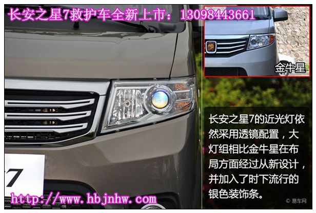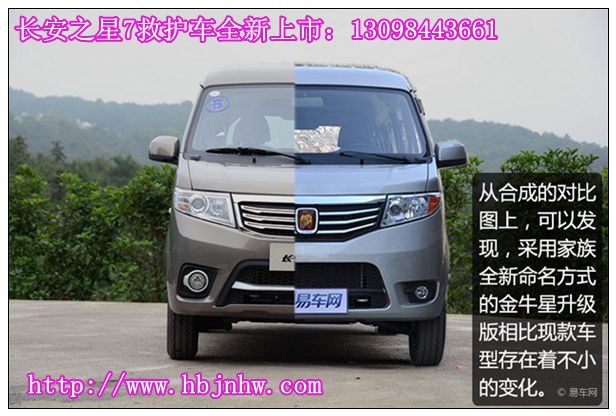 從下面的合成對(duì)比圖上,可以看出長(zhǎng)安之星7救護(hù)車(chē)與金牛星救護(hù)車(chē)在前臉上有很大的區(qū)別與變化,長(zhǎng)安之星7救護(hù)車(chē)前臉更時(shí)尚前衛(wèi)。