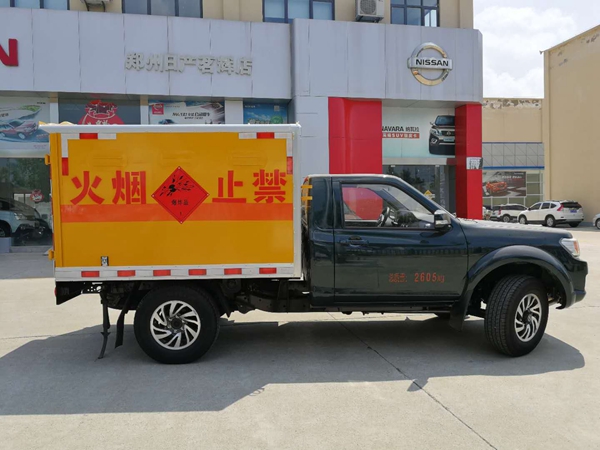 東風(fēng)日產(chǎn)單排皮卡四驅(qū)爆破器材運輸車采用東風(fēng)日產(chǎn)皮卡車底盤,四輪驅(qū)動,配載綿陽新晨動力機械有限公司生的ZD25T5型柴油發(fā)動機,國五排放,2.5L排量,103kw/140馬力;整車尺寸為5160×1825,1770×2050,貨廂尺寸為2200×1690×1060mm,容積為4立方,駕駛室?guī)гb空調(diào)帶方向助力,前碟后鼓式制動,ABS防抱死系統(tǒng),電子限速。